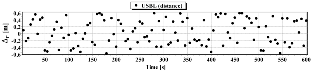 Figure 3 shows that the mean errors of position coordinate increases with the measured distance. It reaches 26.2 m at a distance of 500 m. This is the distance limit at which the USBL “MicronNav System” can work [24].