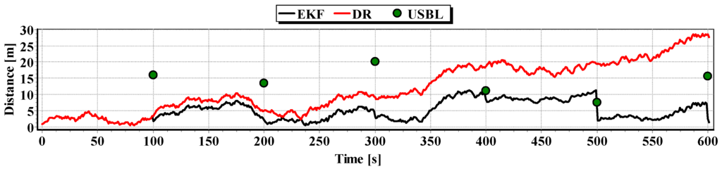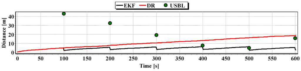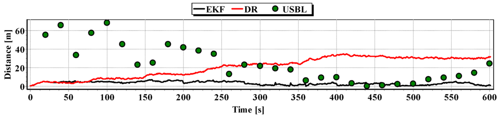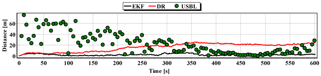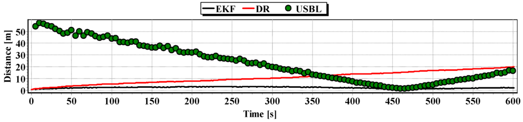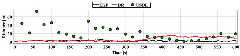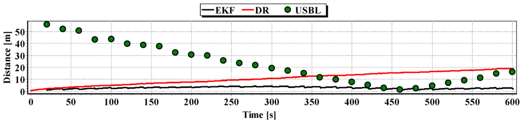 Graphs of the reference position distance from the position estimated by EKF and DR methods and determined by the USBL system for single passage are presented in Figure 27, Figure 28 and Figure 29. The analysis of these Figures shows that the accuracy of the estimated position coordinates using EKF method improves almost every 100 s, when measurements from the USBL system are included in the calculations. The accuracy of the estimated position coordinates using the EKF method is greater than the estimated ones using the DR method and determined by the USBL system. The reference position distance from the estimated ones using EKF method is slightly larger than in previous tests and reach about 11 m. This is due to the long period of estimating the position using EKF without taking measurements of the USBL system.