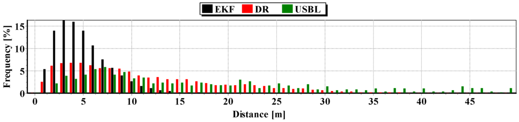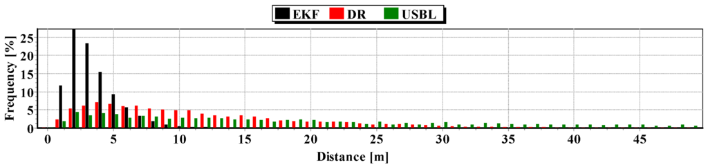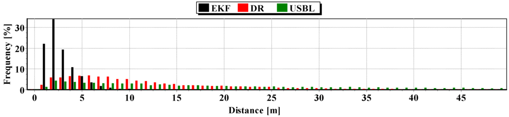The test consisted of carrying out three, and then a hundred passages along the test section. , and were measured every one second. , , were measured every 100 s. The statistical parameters of the positioning errors using EKF, DR methods and the USBL system for single passage are presented in Table 9 (for first passage) in Table 10 (for second passage) and in Table 11 (for third passage).