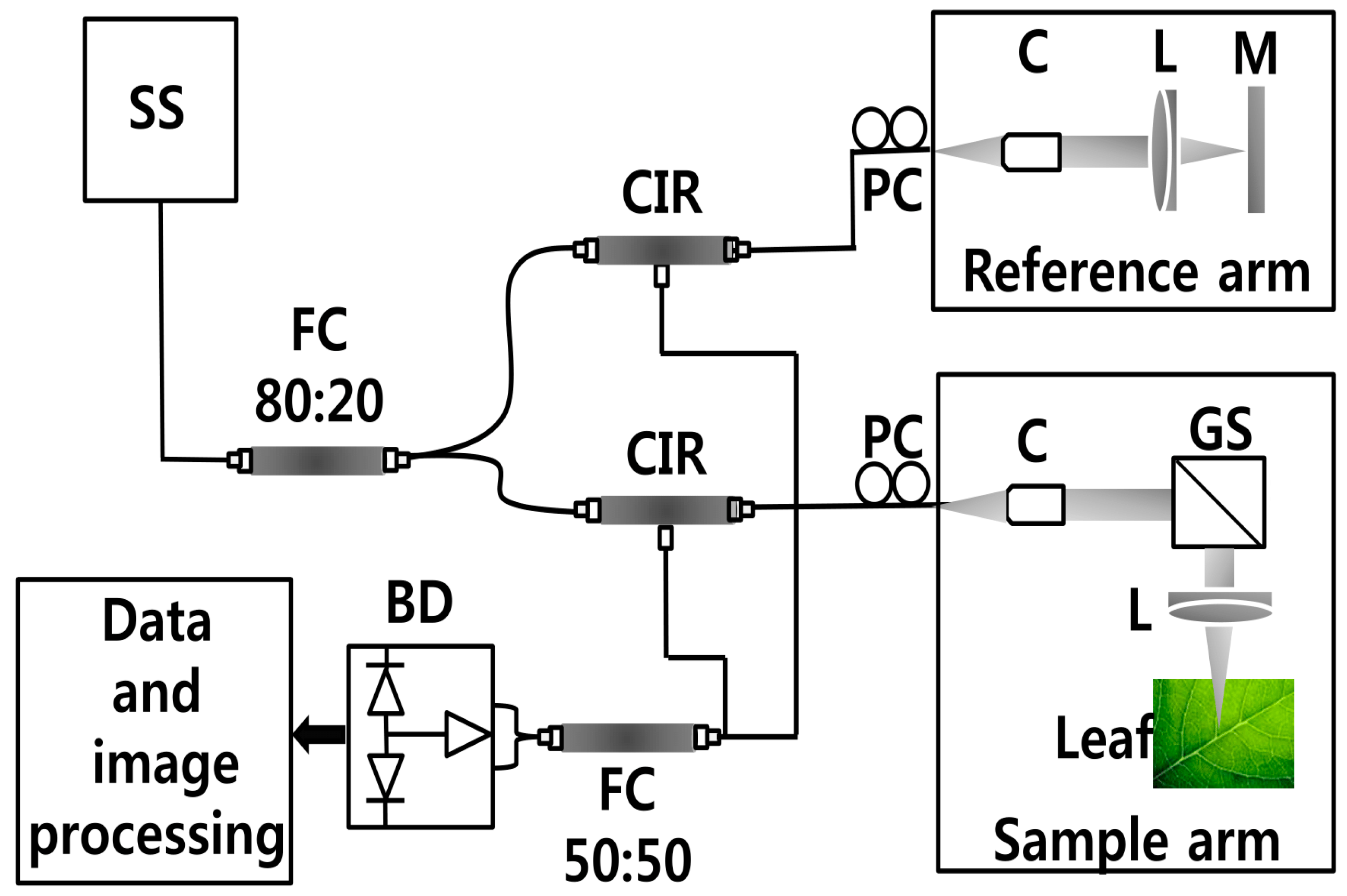 In this study, samples were imaged using a compact SS-OCT system (Oz-tec., Gyeonggi-do, Korea) operating at 1310 nm. Figure 1 depicts the system configuration of the established SS-OCT system. The assembled system employs a commercially available 50 kHz wavelength-swept semiconductor laser (Axsun Technology, Billerica, MA, USA) with a sweep bandwidth of 110 nm and average output power of 20 mW. Additionally, it comprised an AC-coupled dual balanced receiver with a 1 GHz bandwidth (PDB481C-AC, Thorlabs Inc., Newton, NJ, USA), which was used as the detector. Digitization of the OCT signal was achieved using a 12 bit 1.8 GS/s digitizer (ATS9360, Alazar Technologies Inc., Pointe-Claire, QC, Canada). Graphics processing unit (GPU)-based software was used to control the hardware of the imaging modality. The axial resolution of the system is 7.8 μm in air and the transverse resolution of the system is 16 μm in air. The developed OCT system was implemented to diagnose the physical state of the leaf samples, and 50 leaf samples from each leaf category were collected for the experiment. All the leaf samples were scanned with a sufficient cross-sectional scanning range of 3 mm since the diameter of the circular spot was measured to be less than 2.5 mm after the incubation period (120 days). According to the agricultural protocol of the CLS disease, the leaf region of interest was midrib or the middle vein, which is connected to the petiole of the leaf. Therefore, to increase the accuracy of the experiment, six 2D OCT images were acquired from 6 positions near the midrib or middle vein were diagnosed in each leaf prior to the occurrence of leaf spots. However, due to the similarity of the obtained images, 2D OCT image of a single representative position from each leaf category is shown in the results.