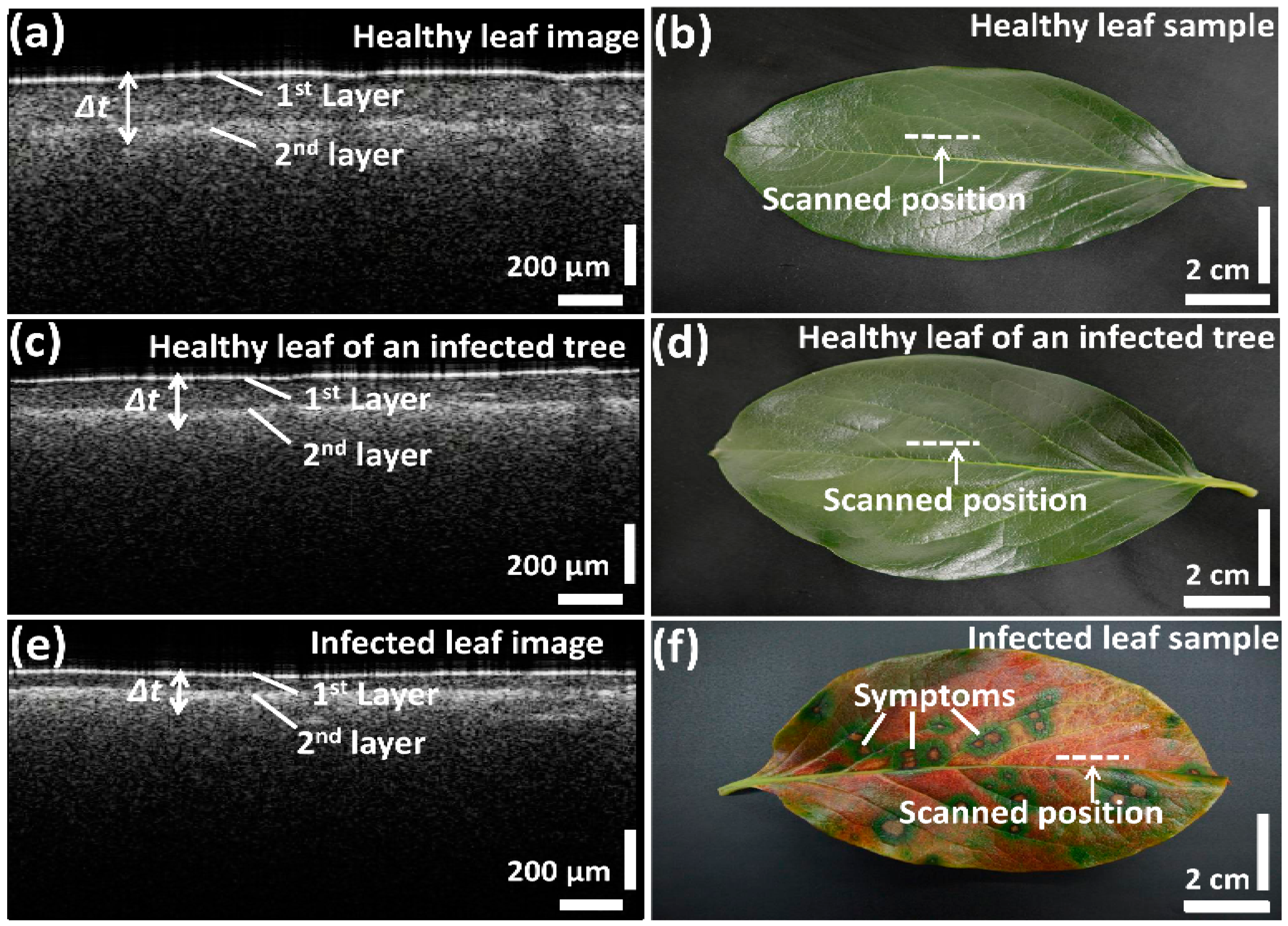 Two-dimensional SS-OCT images and photographs of the leaf samples; (a,b) healthy leaf; (c,d) healthy leaf of an infected tree; (e,f) infected leaf.