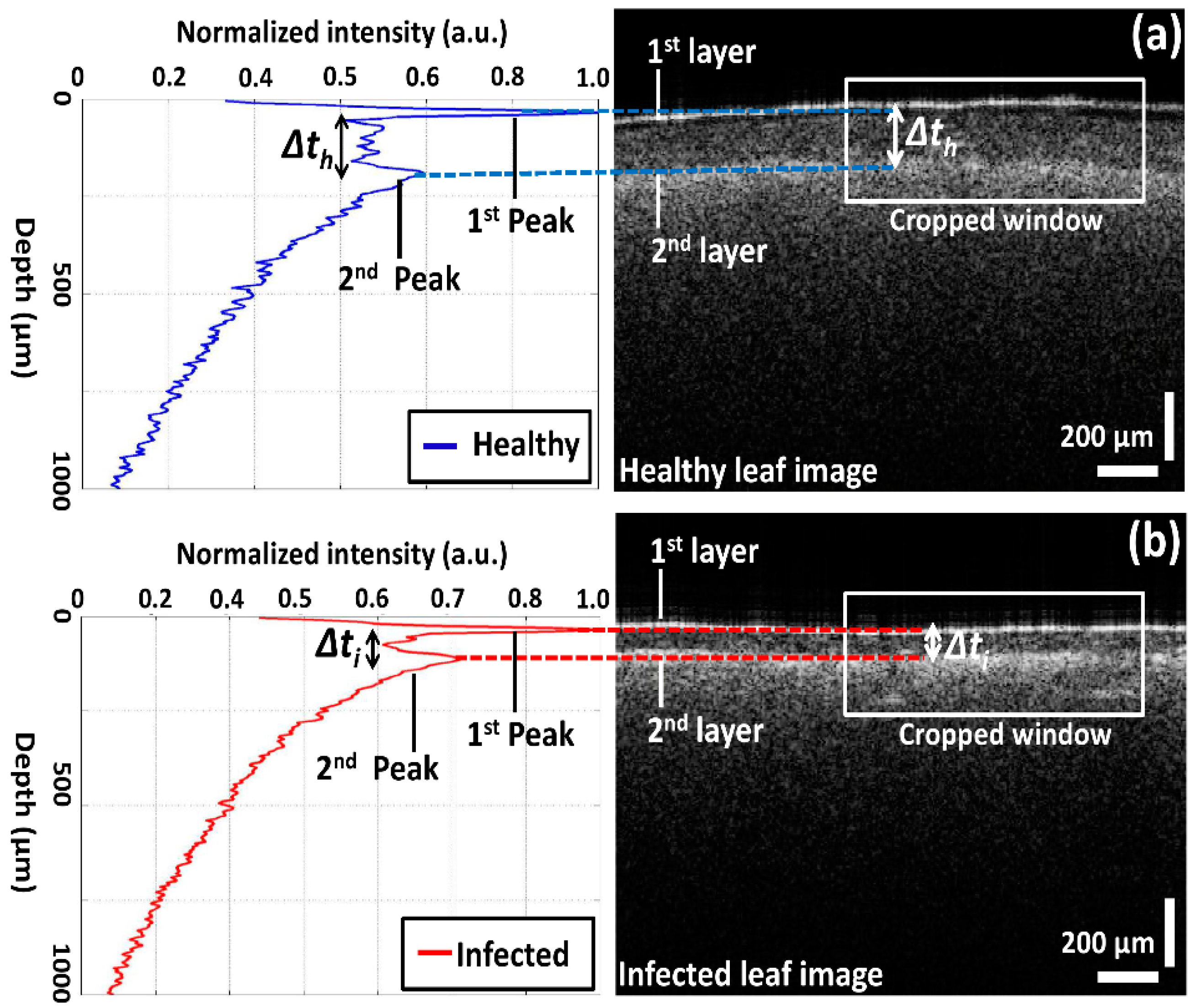 A-scan profiles of healthy and infected leaves and corresponding layer information: (a) healthy leaf; (b) infected leaf. White square region depicts the selected cropped window for averaging 200 intensity signals.