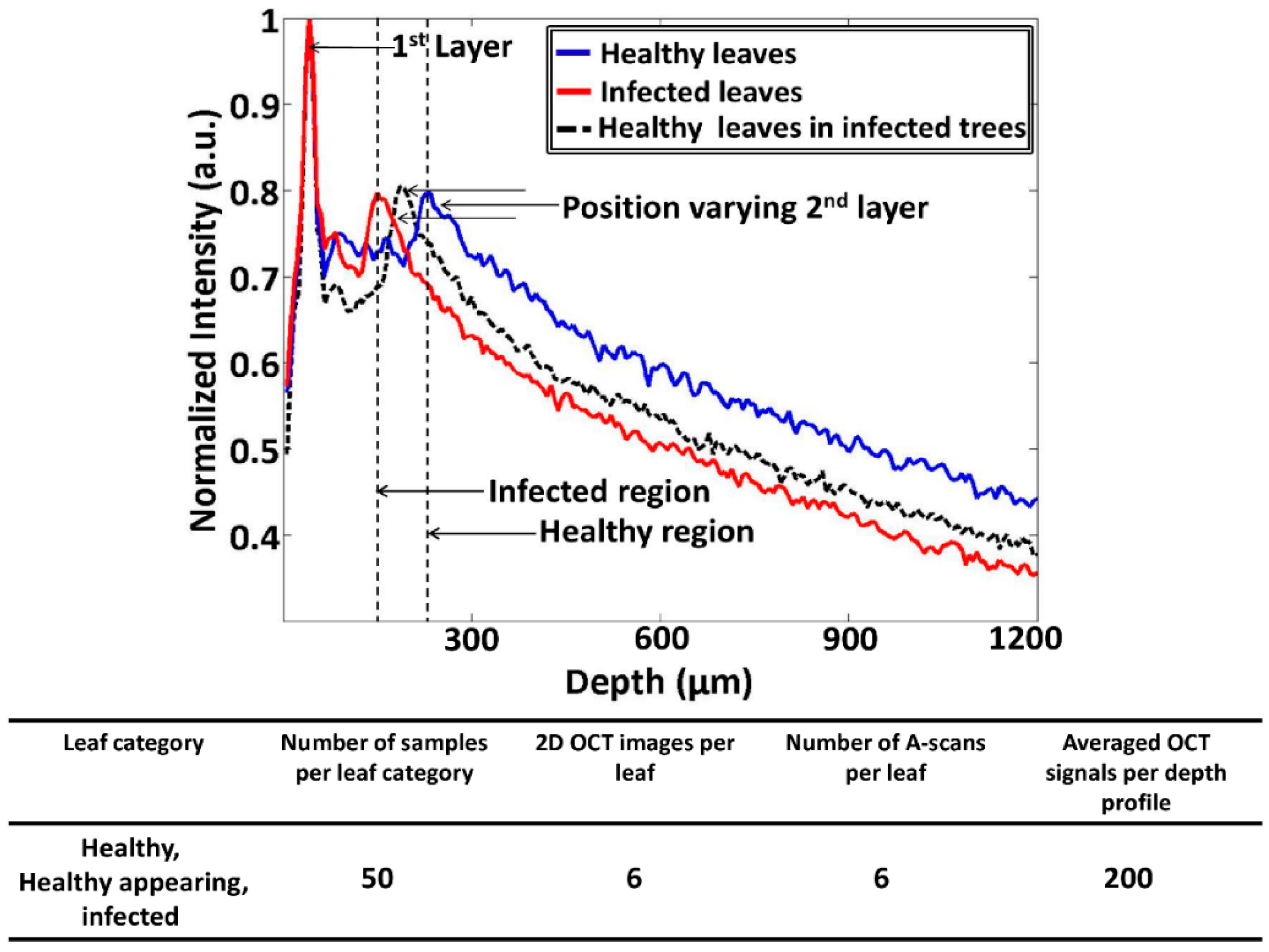 Here, the Δt magnitude seen in Figure 3b was reduced and moved towards the first peak as a result of CLS disease. The aforementioned reduction in thickness (Δt) is considered to be the main initial symptom of the disease, and it is caused due to the reduction of the palisade parenchyma cell layer. Hence, it is essential to identify the palisade parenchyma cell layer thickness at an earlier disease stage in order to determine the physical status of the leaf sample. The A-scan profile results comparison for healthy, infected, and healthy-looking leaves from infected trees illustrating the representative OCT signal information behavior of each leaf category is shown in Figure 4. Additionally, a table containing all the experimental and numerical factors is shown along with Figure 4. The healthy and infected peak information (width of the peak) indicated in the A-scan profiles are consistent with the previous results. However, the width of the peak for healthy-looking leaves from infected trees was located between the healthy and infected peaks. Therefore, OCT is capable of identifying the physical state of the leaves at an initial stage of CLS infection.