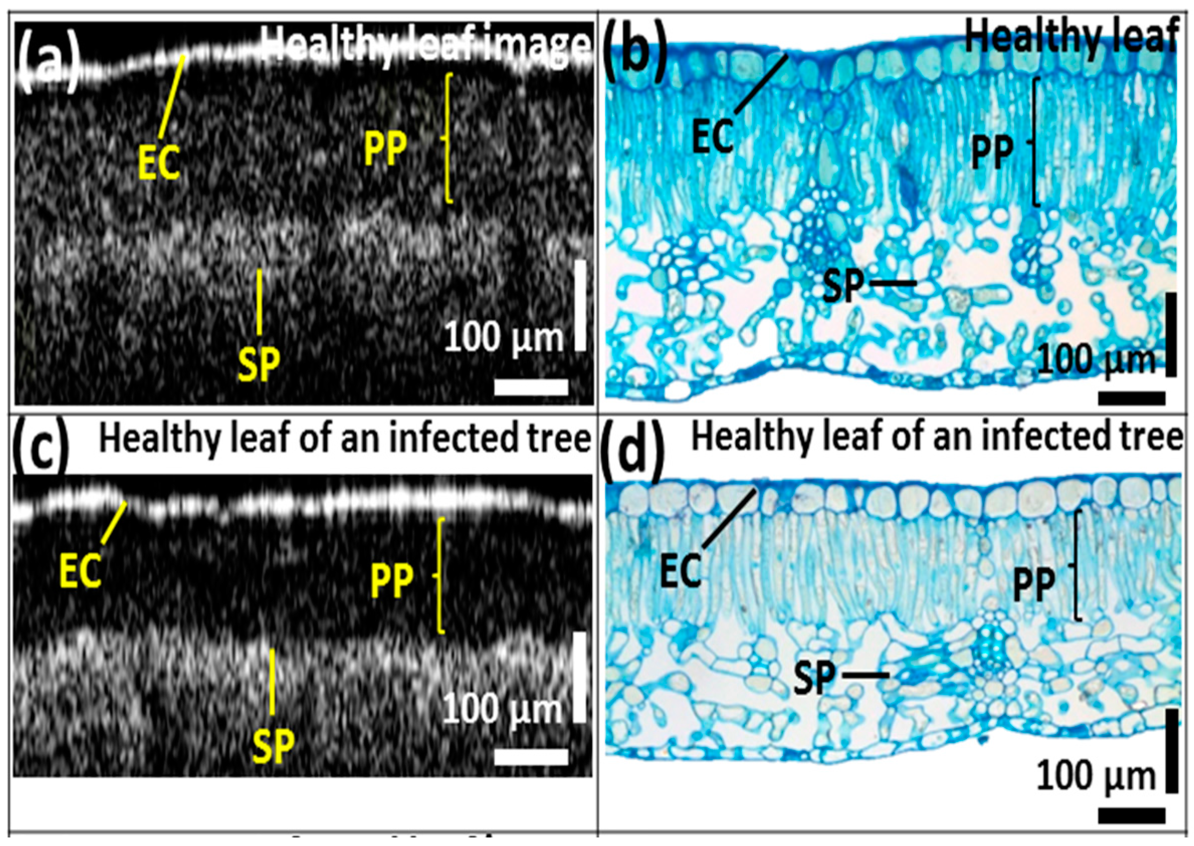 To explore the morphological differences in CLS-infected leaf samples at an initial stage, we adapted optical coherence tomography (OCT), which is a non-destructive optical imaging modality that is capable of providing cross-sectional and three-dimensional images [9,10]. Although the transmission depth of OCT is limited, it offers a high level of sensitivity when capturing depth-resolved images with a high signal-to-noise ratio. Thus, OCT is widely applied in various fields such as ophthalmology [11,12], dentistry [13], otolaryngology [14], and inspection of industrial defects [15]. Recently, OCT has become a prominent imaging modality in the field of agriculture. Several research groups have adapted OCT for the microstructural analysis of kiwi and apple peels to introduce three-dimensional image protocols [16,17]. Furthermore, differences in the hull thickness of four different species of lupin seeds were studied using OCT to measure the precise optical thickness of the layers [18]. Numerous studies have been performed to inspect various infections in melon seeds, cucumber seeds, apple leaves, and orchids, which were quantitatively and qualitatively analyzed to limit the spread of diseases in the plantations [19,20,21,22]. Several reports on the applicability of OCT to plant tissues have been published, which describe the detection of defects, rot, and disease in onions [23,24].