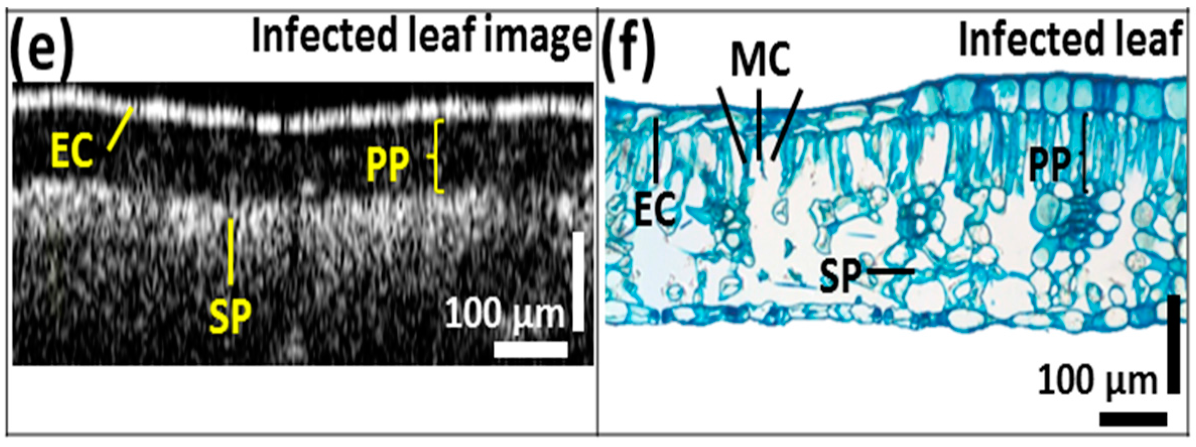 - Lee, C.-H.; Lee, S.-Y.; Jung, H.-Y.; Kim, J.-H. The application of optical coherence tomography in the diagnosis of marssonina blotch in apple leaves. J. Opt. Soc. Korea 2012, 16, 133–140. [Google Scholar] [CrossRef]