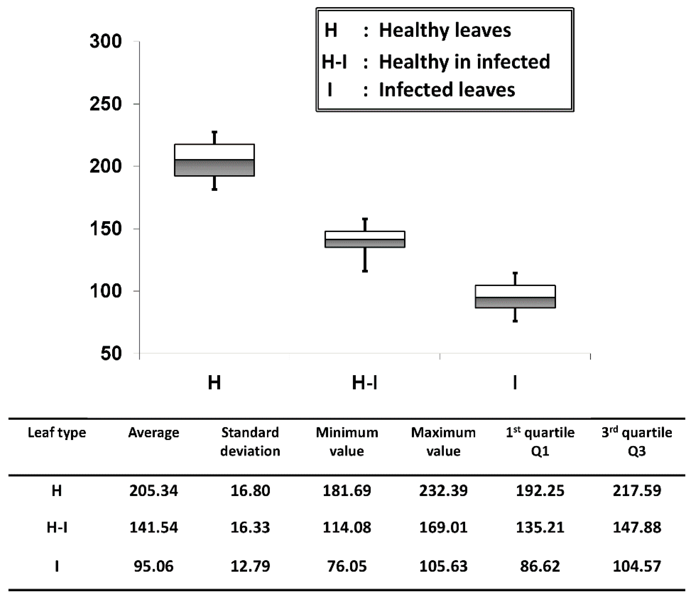 We evaluated the palisade parenchyma layer thickness of all six positions per leaf sample and for all 50 samples per each leaf category (50 leaf samples were tested from each leaf category) and averaged them. The thickness quantification was obtained through the OCT A-scan profile signals and this was achieved through an automated signal processing program [19]. On the OCT images, the layer thickness of the palisade parenchyma cell layer in each leaf category was quantified and the results are shown in Figure 6. The average palisade parenchyma layer thickness of the healthy leaf category was about 205.34 ± 16.80 μm e bars indicate ± standard deviation). A considerable reduction in thickness was observed in healthy-looking leaves from infected trees, and the average thickness was about 141.54 ± 16.33 μm. The average thickness identified in infected leaf samples was about 95.06 ± 12.79 μm, which shows the lowest thickness range among all three categories. As a consequence, the quartile region (Q1~Q3) of the results can be implemented as a thickness threshold range to obtain rapid confirmation about the physical state of the leaf by only measuring the thickness difference between the first two peaks of the A-scan profiles, which represent the epidermal and spongy parenchyma cell layers. The statistical values and quantifications such as the average, standard deviations and errors, and minimum and maximum fluctuation range were included in a summarized table along with the graph. Therefore, the efficacy of the proposed method can be enhanced by analyzing the physical state of the leaf at an initial stage using the performed precise quantification method.