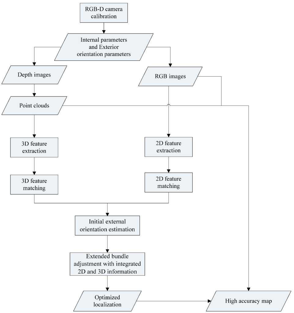 The flowchart of our method is shown in Figure 1, which consists of the following steps: (1) RGB image and depth image registration; (2) 2D and 3D feature detection and matching; (3) initial exterior orientation calculation; (4) high-accuracy exterior orientation estimation by extended bundle adjustment with 2D and 3D information.