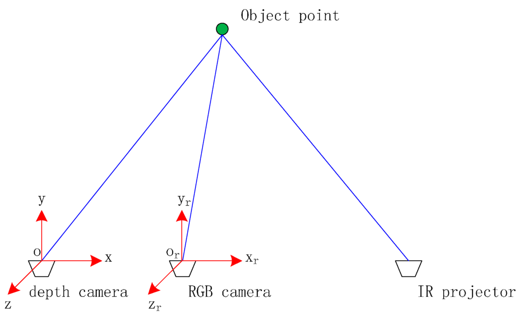 Figure 2 shows the spatial relationship between the depth camera (IR camera) and the RGB camera. o-xyz and or-xryrzr are defined as the coordinate systems of the depth camera and the RGB camera, respectively, whose origins coincide with their respective camera optical centers. The z (zr) axis points along the optical axis, the x (xr) axis is horizontal to the right and perpendicular to z (zr) axis, the y (yr) axis is defined to form a right-handed system. The transformation relationship between the RGB camera and the depth camera can be expressed by a 3 × 3 rotation matrix R and a translation vector . Supposing that there is an object point , the depth value obtained by depth camera is d and the projected points on the depth image and the RGB image are and , respectively. Take the depth camera coordinate system as the reference coordinate system, the imaging geometric models of the two cameras can be represented as: