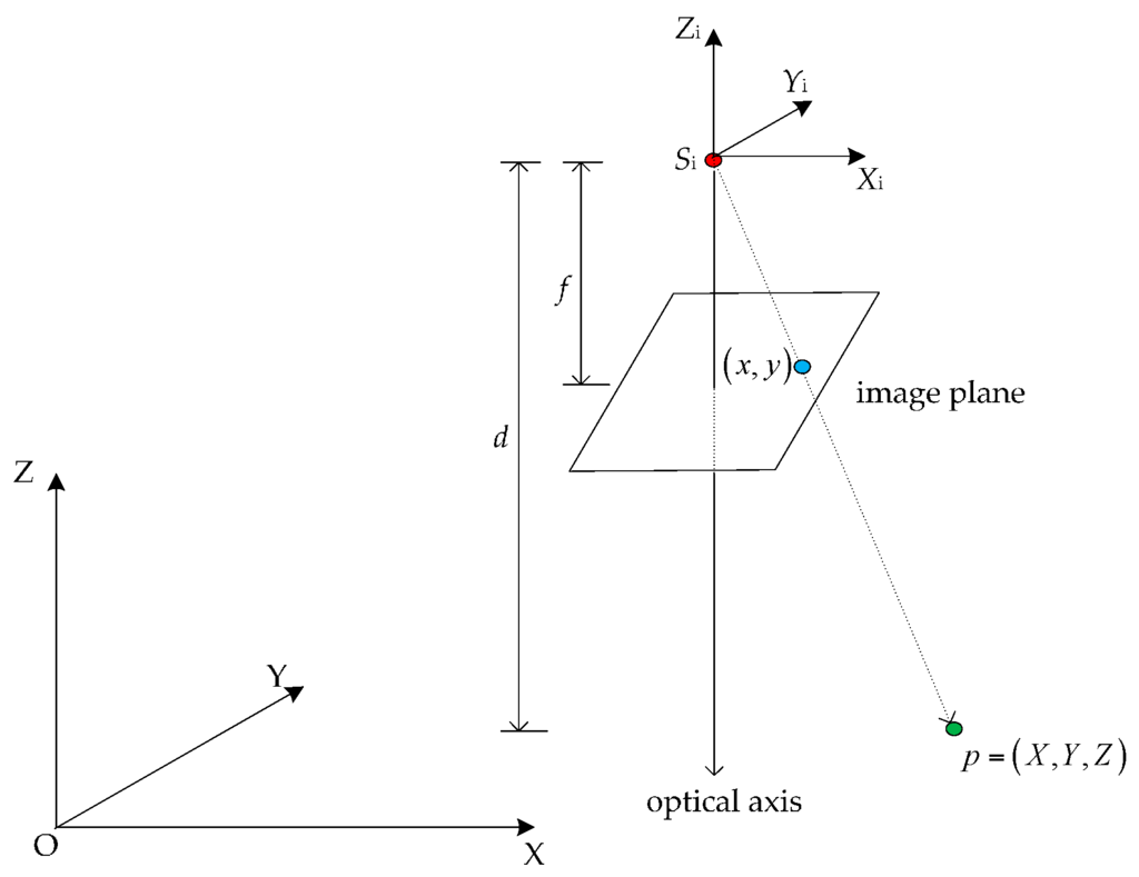 The projection model of a RGB-D camera represents the relationship of an object point in the real world and its measurements in the RGB-D images. There are two types of measurements: image coordinates from the RGB-image and depth values from the depth image. As shown in Figure 4, supposing the position of the depth camera is Si in the world coordinate system O-XYZ. The camera pose is and which express the relationship between the world coordinate system and the local camera coordinate system Si-XiYiZi. For an object point , its image plane coordinates is (x,y) and the depth value is d.