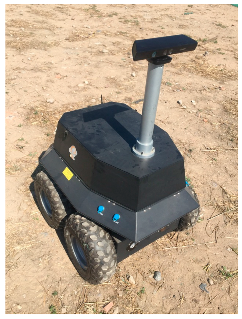 To verify the actual performance of the proposed method, two field experiments and a contrast experiment using an open RGB-D dataset have been performed. Figure 5 shows the moving platform (model rover) used in these experiments. A Microsoft Kinect V1 camera which has an image resolution of 640 × 480 pixels and a horizontal field of view of 42 degrees was rigidly attached on the top of the camera mast. The camera is about 100 cm above the ground.