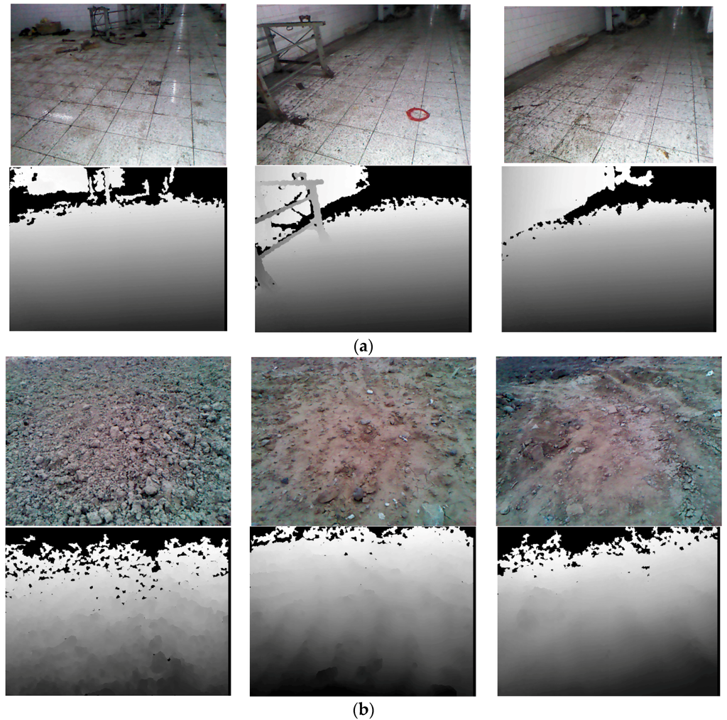 In experiment I, the remote-controlled rover travelled from the first control point to the second control point (the distance is 46.97 m) and captured approximately 800 frames of RGB and depth images. In experiment II, the rover traveled about 200 m and captured 2600 frames. Figure 6 shows some typical images acquired by the RGB camera and the depth camera.