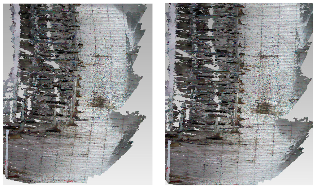 Overhead views of the 3D mapping results in Experiment I. The left figure is the result of the traditional method. The right is the result of the proposed method in this paper.
