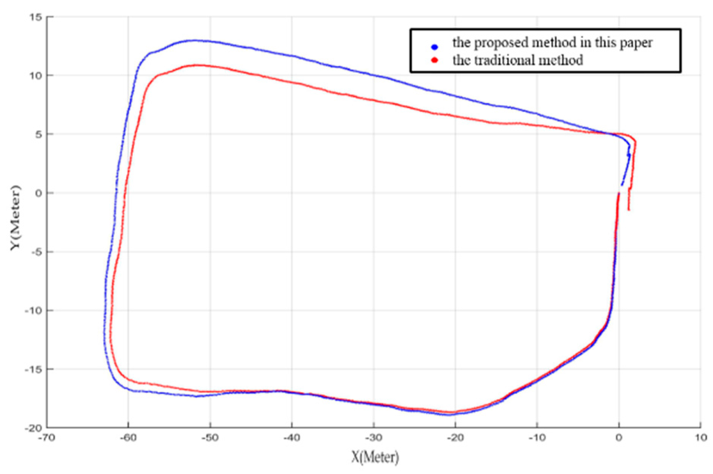 In Experiment II, the error of the proposed method is 2.48%, which is better than the 3.84% error obtained by the traditional method. The statistical result is shown in Table 4 and the estimated rover paths are shown in Figure 8 and Figure 9.