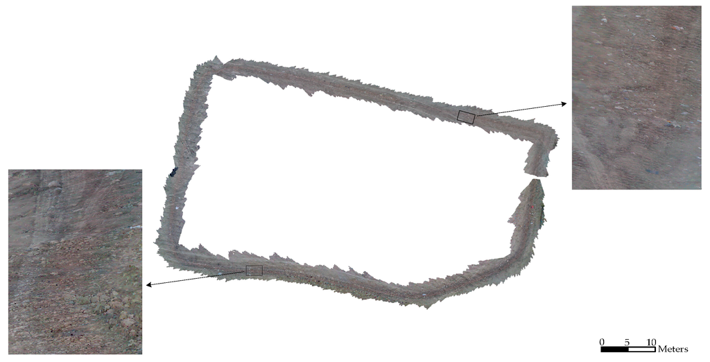 From Figure 8, obvious improvement can be seen with the closure error decreases from 3.84% to 2.48% using the proposed method in this paper. The mapping result in Figure 9 shows that our method can obtain a highly accurate map even without loop closure detection. Each inset in the Figure covers an area of about 3 m in length and consists of about 40 frames of point clouds. The detailed maps show that there are no gaps or artifacts between each frame, meanwhile objects on the ground such as small rocks and the tracks of the rover are reconstructed seamlessly in high precision.