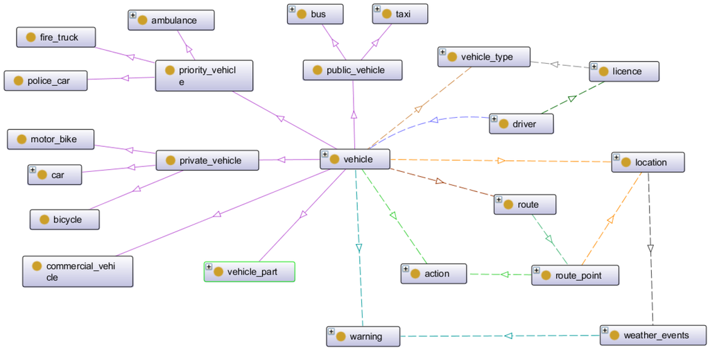 The first group is related to vehicles. The concepts of this group are shown in Figure 2. The figure shows the taxonomy of vehicles, which can be classified into: commercial vehicles, public vehicles (bus and taxi), private vehicles (car, bicycle and motorbike) and priority vehicles (ambulances, fire trucks and police cars). Different relationships between vehicles and other entities are also defined in this group. Some of these entities are: location, which represent the exact latitude and longitude of a vehicle, route point or infrastructure item; information about drivers and the vehicle’s types which they can drive by license. The principal relations defined in this group are: has_vehicle_type (vehicle, vehicle_type), has_driver (vehicle, driver), has_licence (driver, licence), can_drive (licence, vehicle_type), has_route (vehicle, route), has_route_point (route, route_point), has_location (vehicle, location), has_location (route_point, location), has_location (weather_events, location), has_action (vehicle, action), has_ation (route_point, action), has_warning (vehicle, warning), has_warning (weather_events, warning).