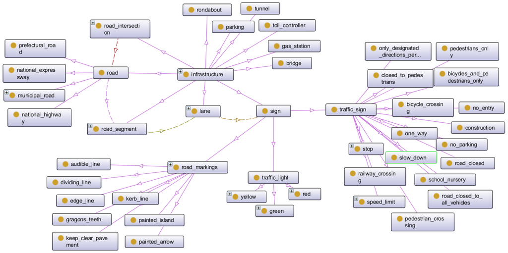 - Zhao, L.; Ichise, R.; Mita, S.; Sasaki, Y. Ontologies for Advanced Driver Assistance Systems. Journal of the Japanese Society for Artificial Intelligence (JSAI), Technical Report, SIG-SWO-035-03. Available online: http://www.ei.sanken.osaka-u.ac.jp/sigswo/papers/SIG-SWO-035/SIG-SWO-035-03.pdf (accessed on 12 August 2016).