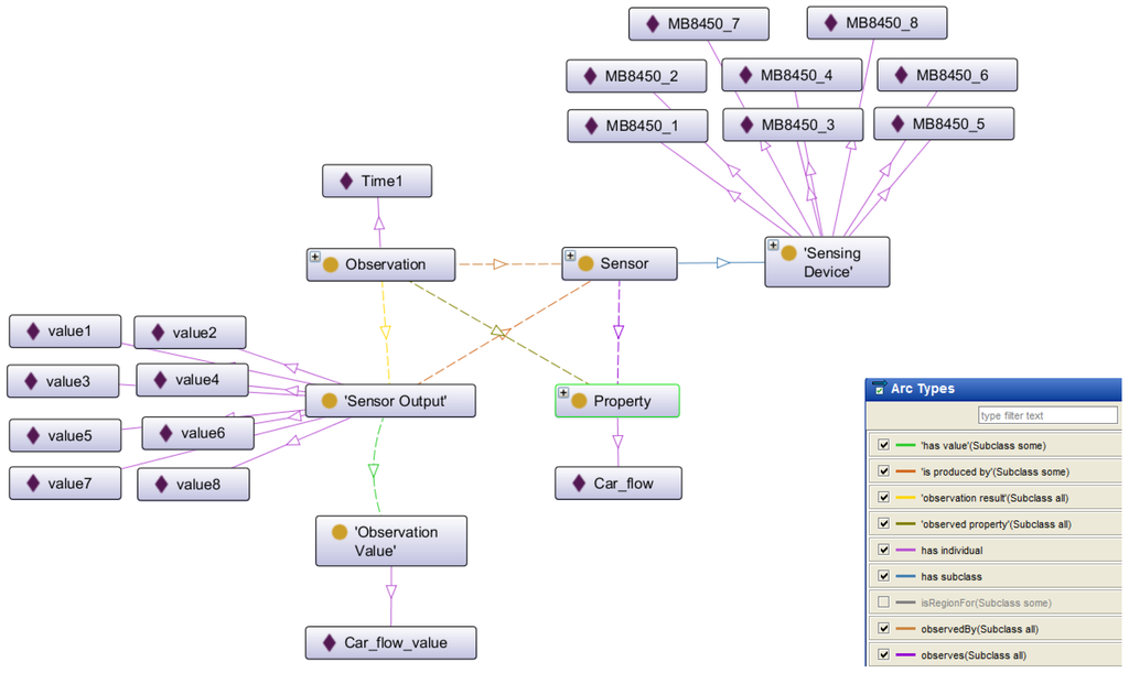 After the last step, the output RDF file represents the instance of the SSN ontology according to the sensor data. Figure 5 shows some of the most important elements (concepts, individuals and relations) of the instances from SSN ontology, generated in the traffic light adjustment scenario. The right corner of the figure shows the types of the relations (arcs) identified in this part of the ontology with different colors. As we can see in this view, the sensing devices observes the Car_flow property, producing sensor outputs, with different values.