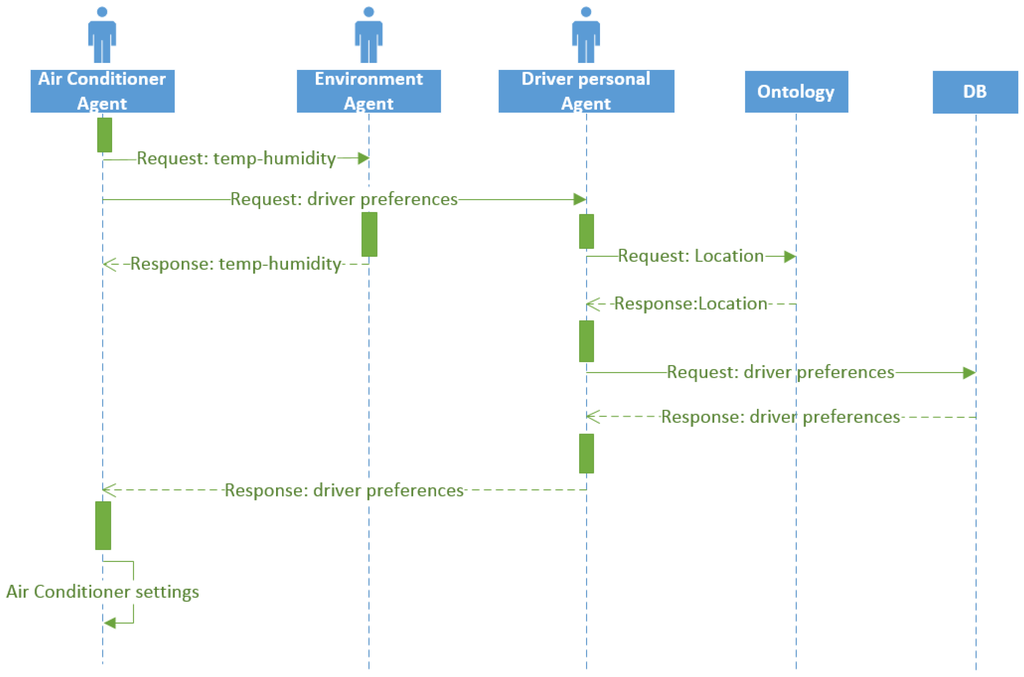 First, in this task, the air conditioner agent sends two request messages regarding temperature and humidity, one asking the environment agent for the temperature and humidity values and the other asking the driver personal agent for the driver preferences. A person may have different preferences in terms of temperature depending on where he/she is located.