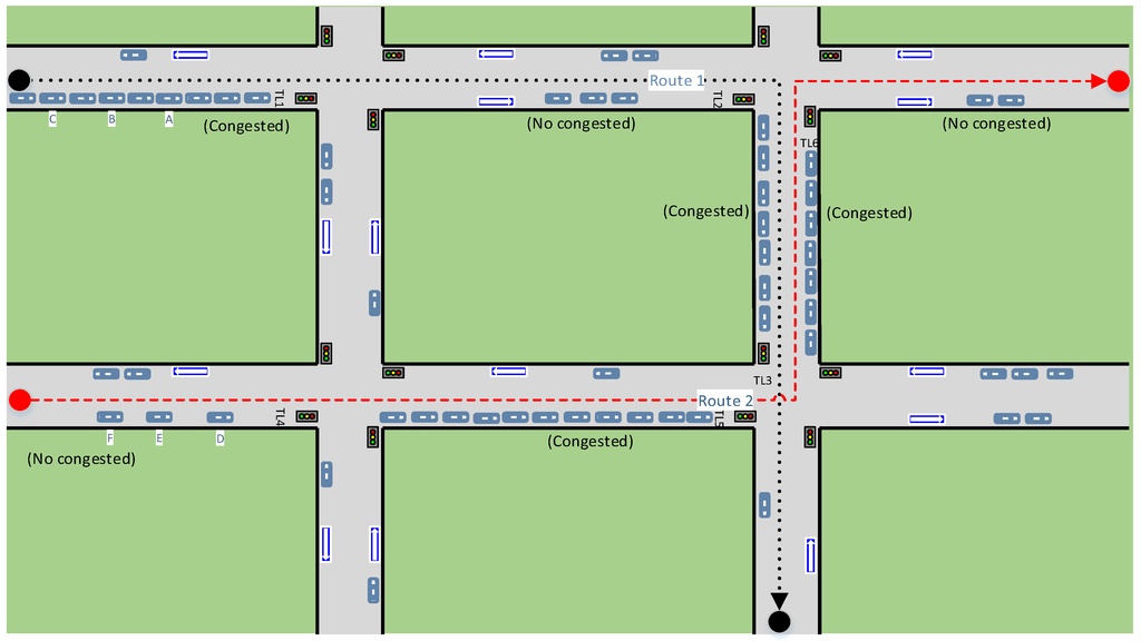 For this experiment we have assumed that all lane segments have 200 m length and all vehicles have a constant speed of 60 km/h. Three traffic lights are involved in each route (TL1, TL2, TL3 are the traffic lights in route 1, while TL4, TL5, TL6 are those involved in route 2). The initial configuration of the traffic lights state and the congestion state of the lane segments where they are located is shown in Table 3.