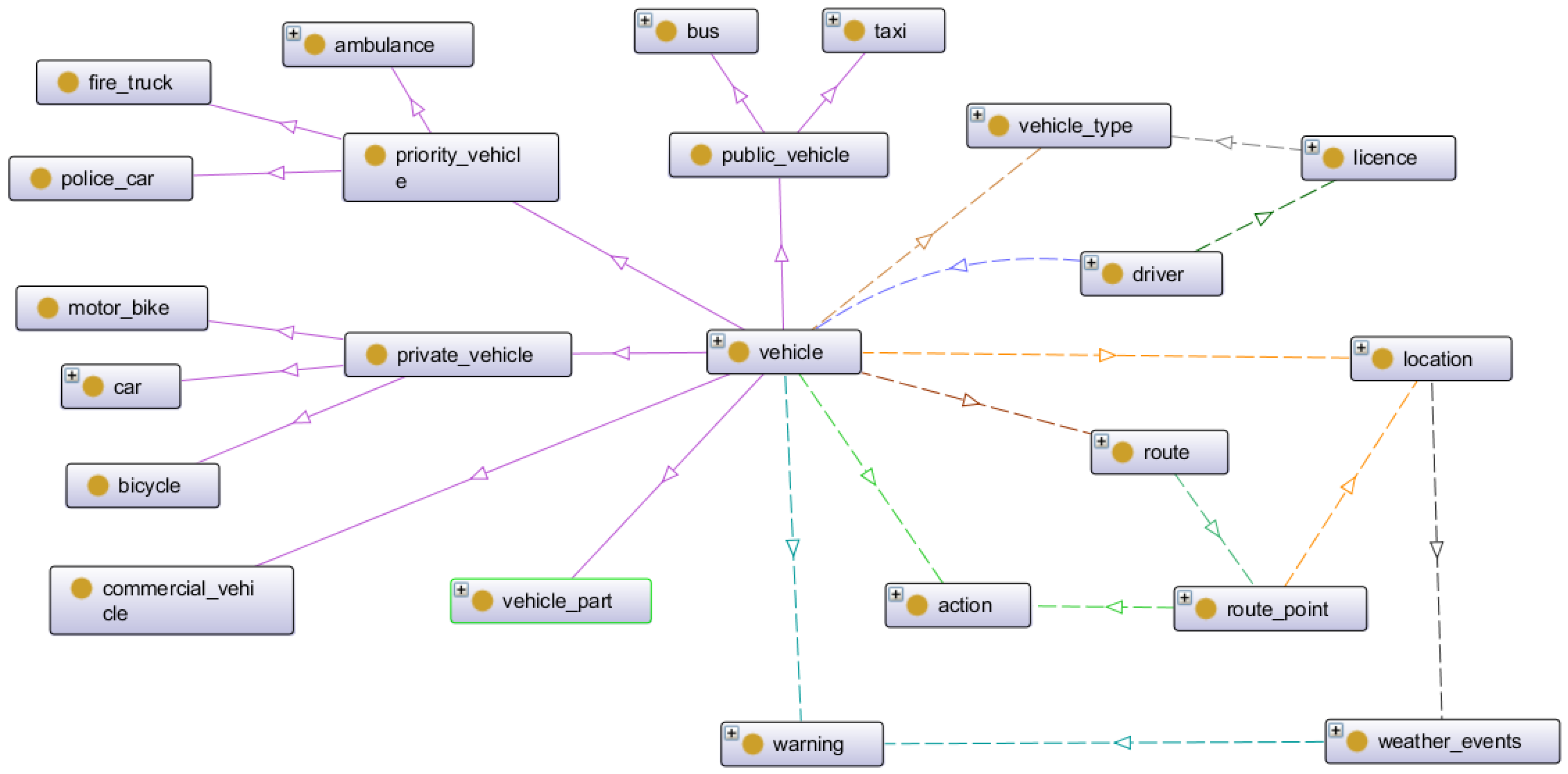 Figure 2. The figure shows the taxonomy of vehicles, which can be classified into: commercial vehicles, public vehicles (bus and taxi), private vehicles (car, bicycle and motorbike) and priority vehicles (ambulances, fire trucks and police cars). Different relationships between vehicles and other entities are also defined in this group. Some of these entities are: location, which represent the exact latitude and longitude of a vehicle, route point or infrastructure item; information about drivers and the vehicle’s types which they can drive by license. The principal relations defined in this group are:
