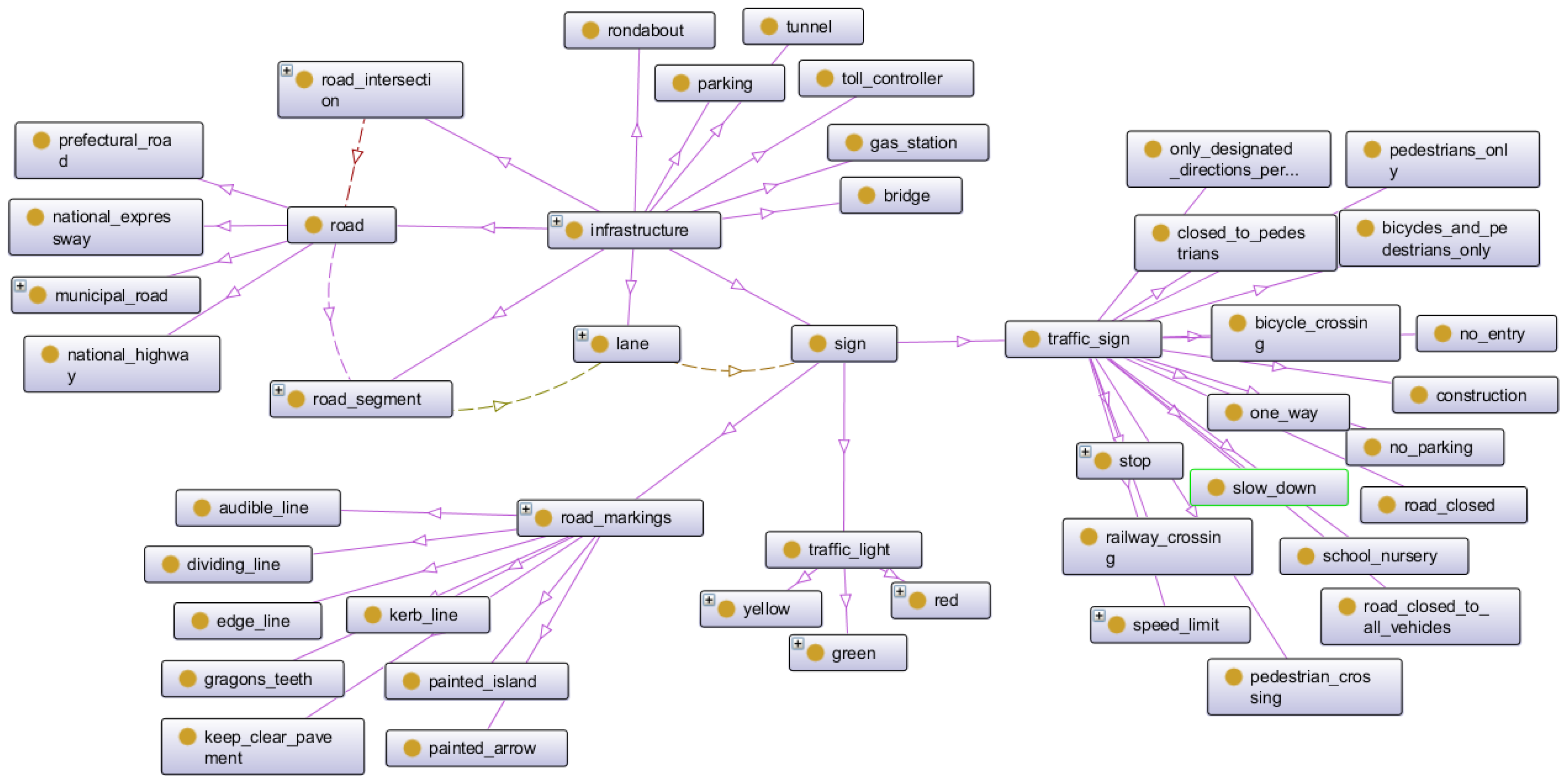 For a better management of traffic situations we divided the roads into segments, connected through intersections. Each segment contains lanes, and different signs such as stop signs or speed control, traffic lights or road markings are per lane. Thus, the principal relations in this group are: IsOnLane (sign, lane), IsOnSegment (lane, road_segment), and IsOnRoad (road_segment, road). Each sign has an action associated following the Japanese traffic regulations.