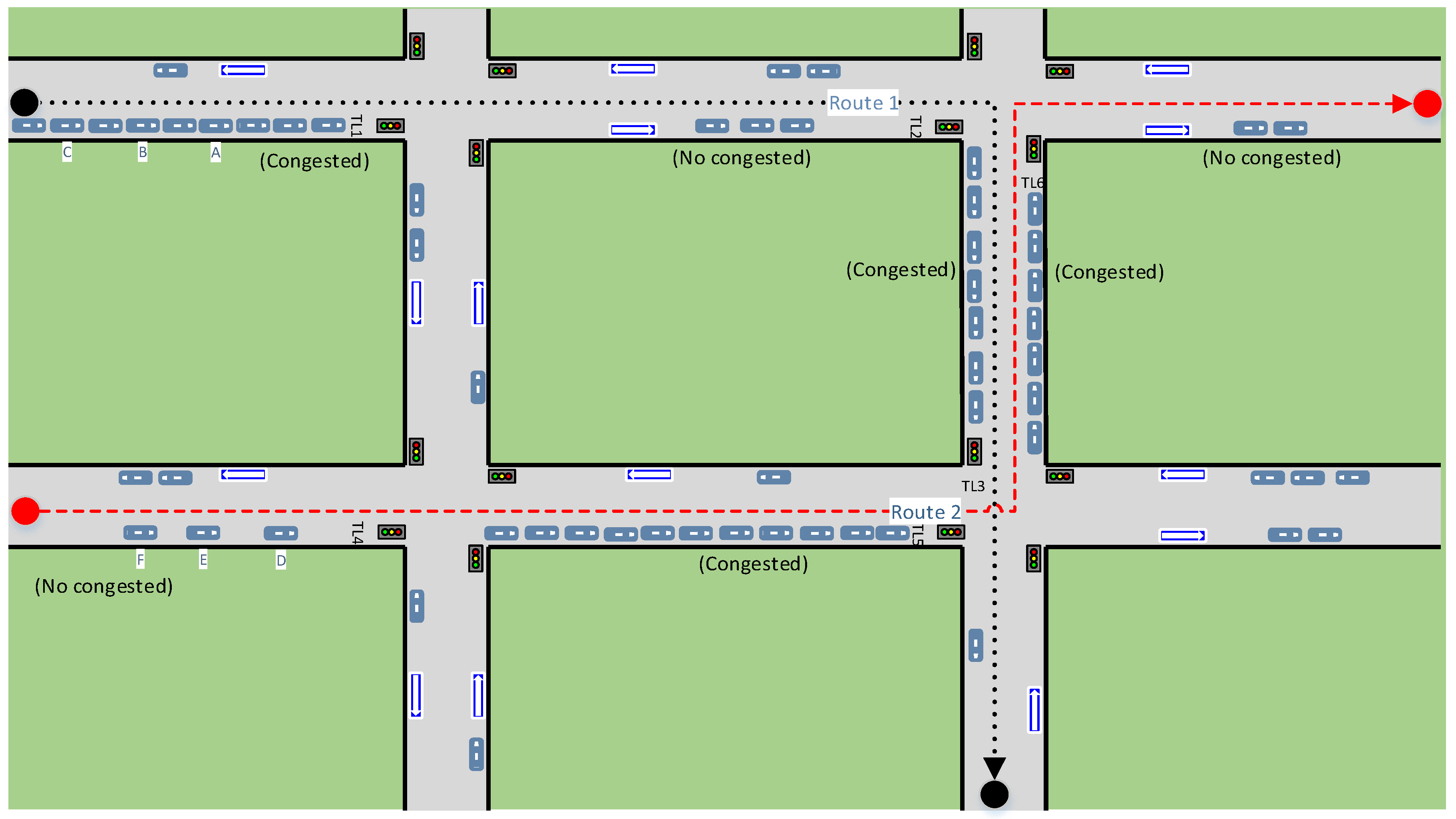 Regarding route 2, the first segment (S21) is not congested and its traffic light (TL4) is in red; the second segment (S22) is congested and the traffic light located in that segment (TL5) is in red and finally the last segment (S23) is also congested but the corresponding traffic light (TL6) is in green.
