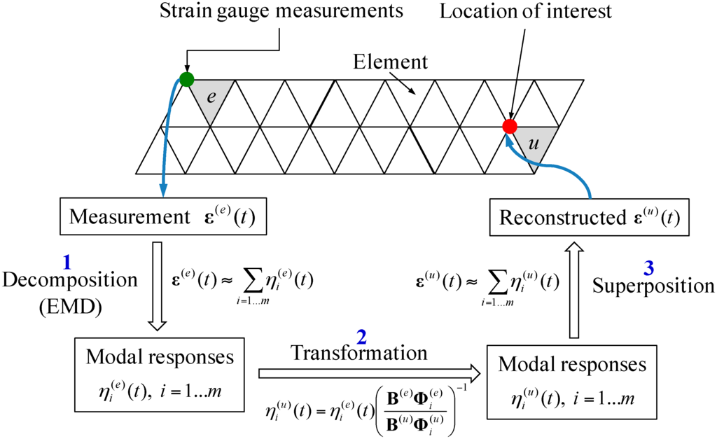 The paper is organized as follows: first, the EMD method for signal decomposition is briefly introduced, and the required signal filtering process using the intermittency criteria is discussed. Next, the transformation equation for strain and stress is derived using the FE model of the structure. Following this, a numerical two-span beam-like structure and a simplified airfoil structure are used to demonstrate and validate the proposed method. A set of experiments were conducted on an aluminium alloy cantilever beam to investigate the effectiveness of the method. Finally, several conclusions are drawn based on the current study.
