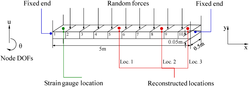 A beam structure is used to demonstrate the overall reconstruction methodology and to investigate the performance of the proposed method under different measurement noises. The beam is 5 m long, 0.5 m wide and 0.05 m thick. The Young’s modulus is 69,600 MPa and the density is 2730 kg/m3. The beam structure is divided into 10 equal segments in the FE model, as shown in Figure 2. Random forces are applied at all vertical direction DOFs of the FE model. The random forces are modeled as Gaussian white noise processes passed through a sixth order low-pass Butterworth filter with a 100 Hz cutoff. One percent of modal damping is considered. Displacement responses are calculated by solving the equation of motion of the beam based on its finite element model using mode superposition method. The sampling frequency is 1000 Hz. Strain responses are calculated using the strain-displacement matrix and Equation (9). The beam is modeled using Euler–Bernoulli beam theory and the 1 × 4 strain-displacement matrix is given by: