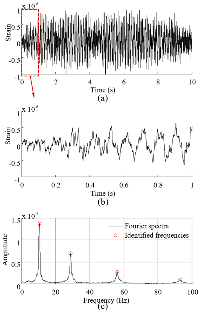 The synthesized strain measurement data and the Fourier spectra of the data. (a) Entire 10 s measurement data; (b) Measurement data (0–1 s); and (c) Fourier spectra of the measurement data.