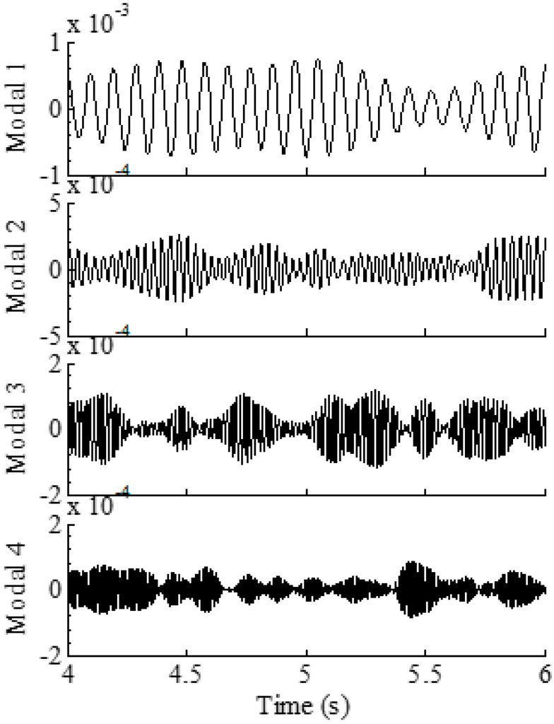 Four modal responses of the strain measurement data obtained using EMD method with intermittency criteria.