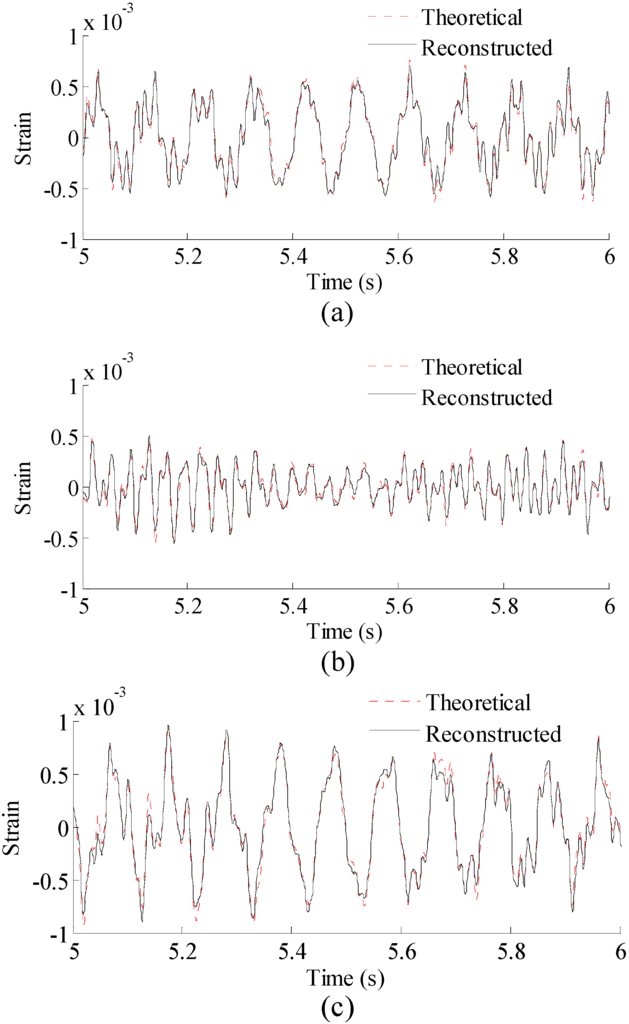 Reconstructed and theoretical strain responses for three locations (Loc. 1–3, Loc. in the paper are short form of location number) in Figure 2. Results are concentrated on 5–6 s for clear presentation. (a) Results for Loc. 1; (b) results for Loc. 2; and (c) results for Loc. 3.