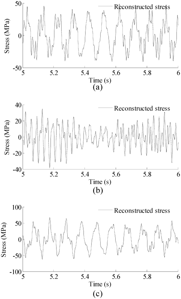 Three seconds of synthesized strain measurement data with 5% RMS noise terms are presented in Figure 8a. The Fourier spectra of the strain measurement data indicates a significant frequency component as shown in Figure 8b. The frequency is used to design the band-pass filter for the modal responses extraction. Figure 9 presents the modal responses obtained by the EMD method with intermittency criteria. The reconstructed strain responses for the location of interest I, and the theoretical results are compared in Figure 10. The reconstructed stress responses based on the reconstructed strain results are shown in Figure 11. The correlation between the reconstructed strain responses and the theoretical strain results is 0.9849.