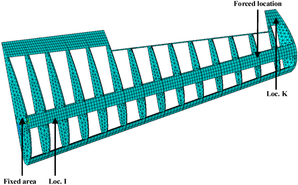 The element type is solid185 so that it is automatically meshed with hexahedron or (reduced) tetrahedron elements in ANSYS. Each of the elements has 8 nodes and 24 DOFs in total. Each node has 3 DOFs, namely the displacements of x, y, and z-axis directions. All the nodes attached to the airframe (i.e., z = 0) are prescribed and the structure has 19,956 DOFs. Required properties of the FE modeling in ANSYS are listed in Table 2.