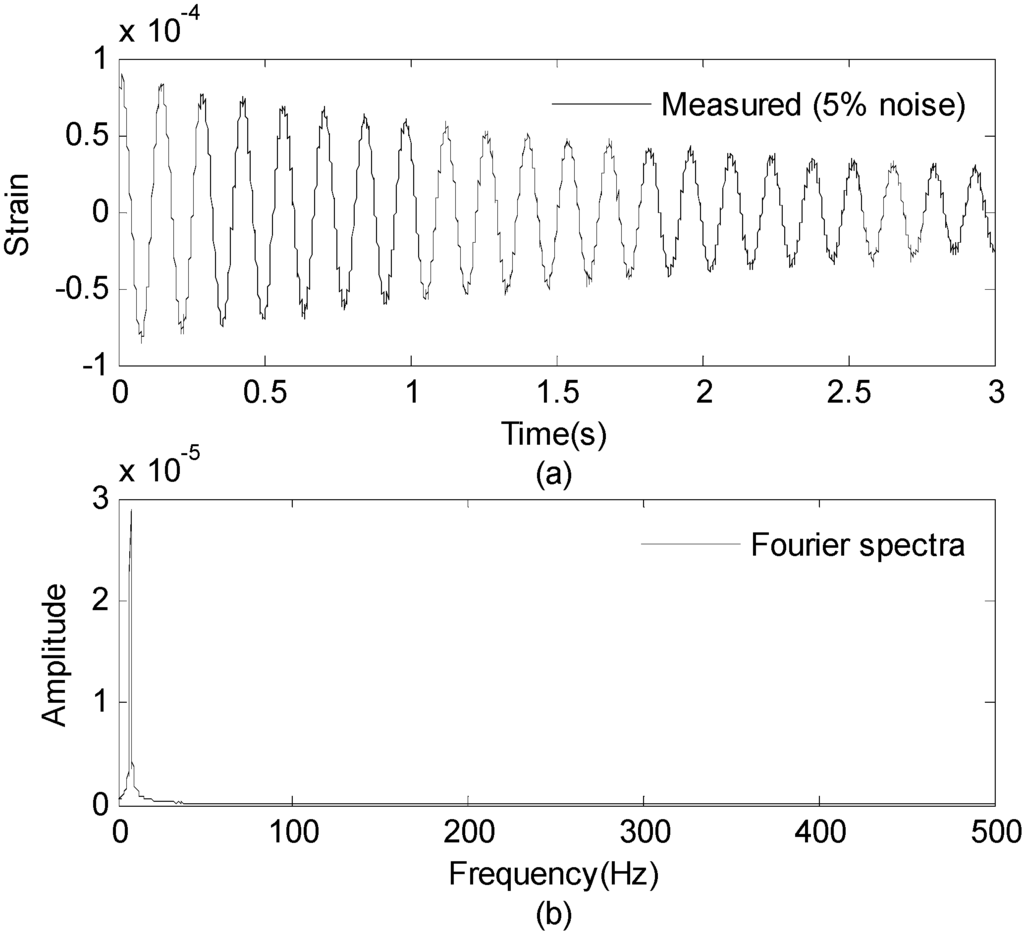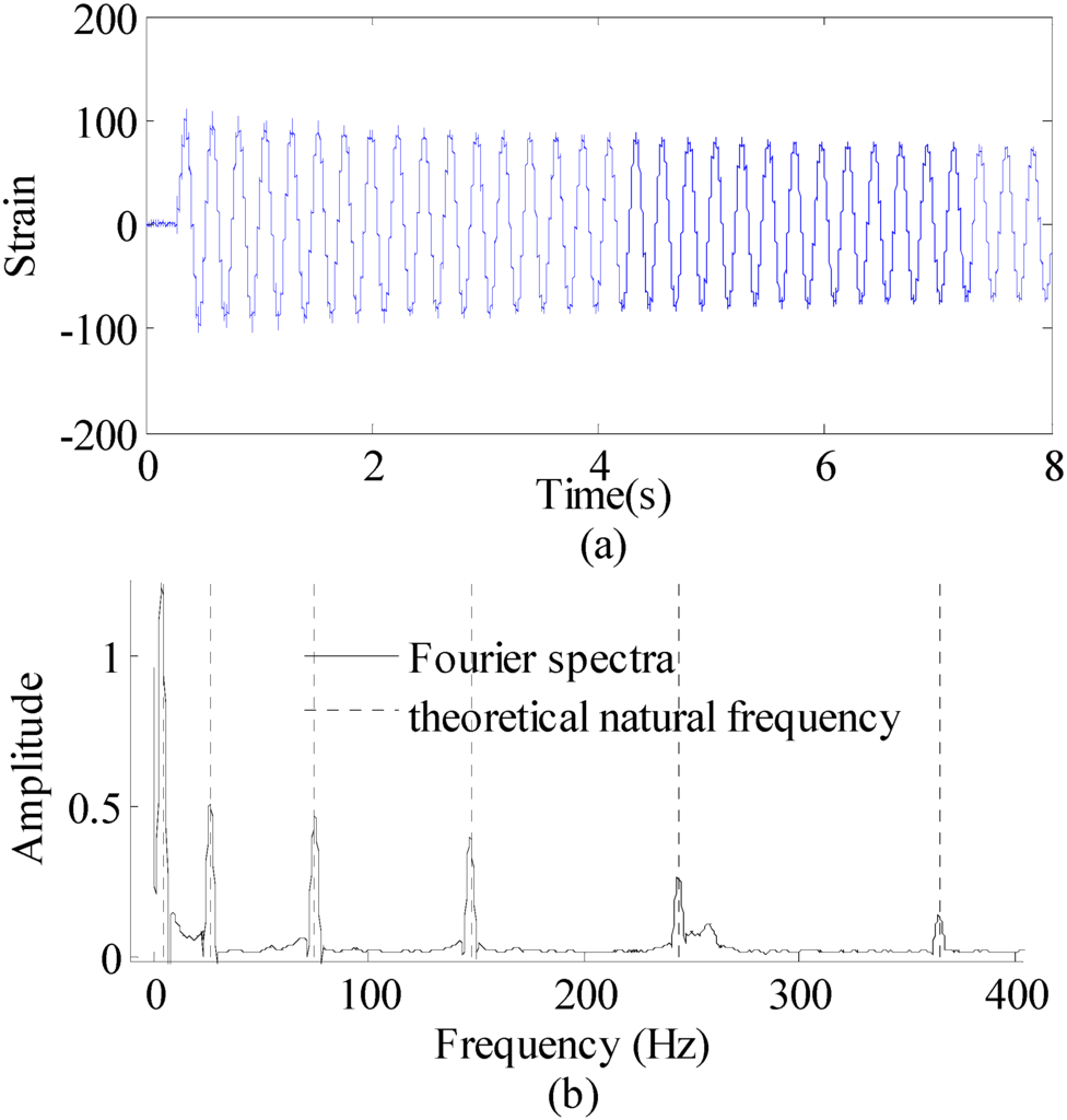 Strain measurement data and Fourier spectra of the data. (a) Strain measurement data (0–3 s); and (b) Fourier spectra of the measurement data (0–3 s).
