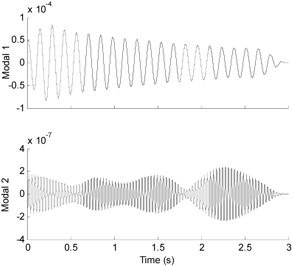 where xi(t) is the modal response (that is also an IMF) for the ith mode. Terms fi(t) (i = 1,2,…,n–m) are other IMFs but not modal responses.