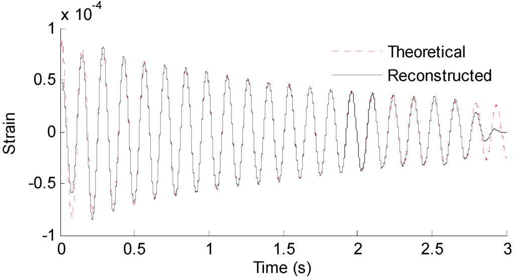 It is observed from Figure 20 that the reconstructed response agrees well with the theoretical solution. The correlation between measured strain responses near the fixed end and reconstructed responses results is 0.9522. This case study demonstrates the capability of the proposed method for handling different sensor location cases. However, clarifications are made as follows: Firstly, in this case study, signals from different locations have the same signal-to-noise ratios hypothetically. However, signal-to-noise ratio can be quite different for different locations due to the different signal amplitude in real engineering applications. The noise will dominant the signal for very small signal amplitude cases. Thus, the sensor location will have significant effect on the accuracy of reconstruction results under this circumstance. Secondly, if the sensor is installed at or near the nodal point of a particular mode, the strain responses may not capture all the excited modes. In such cases, an IMF for this specific mode will be close to zero. Therefore, it is difficult to reconstruct the strain responses at the point of interest.