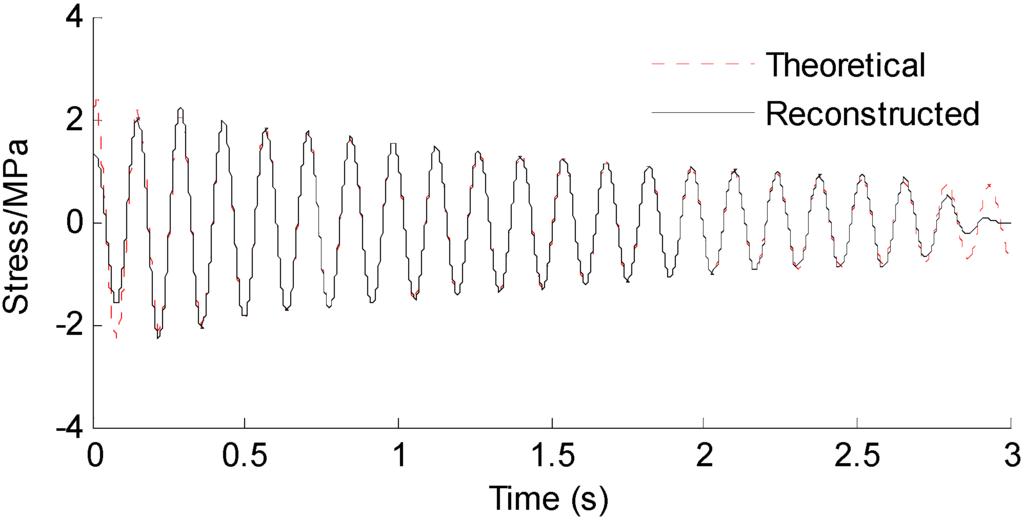 - In this study, a time domain strain/stress reconstruction method based on EMD is proposed. According to numerical analysis results, the proposed method can produce results which are very close to theoretical solutions considering a practical noisy measurement system. The reconstructed results have an overall correlation coefficient larger than 0.975 under 10% RMS noise settings. The discrepancy between actual measurements and reconstruction results at the boundary region are possibly caused by the end boundary effect of EMD method.