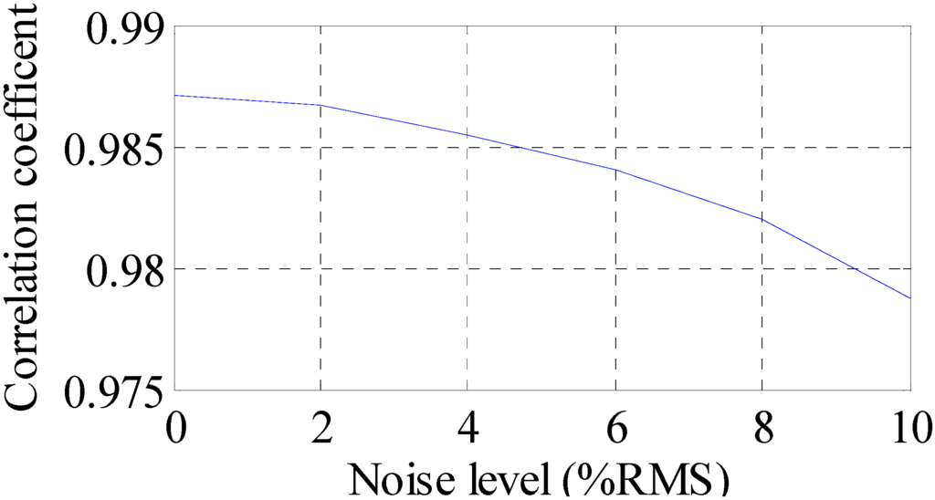 It can be seen that the performance is degraded with the increase of noise level. The overall performance of the reconstruction method is larger than 97.5% when noise levels are not larger than 10% RMS in this example. Next, the experimental validation of the time domain strain and stress reconstruction method is presented.