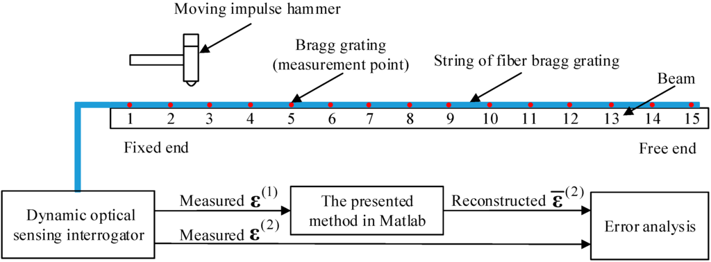 To investigate the influence of the sensor location to the performance of the proposed time domain strain/stress reconstruction method, a total of 15 optical fiber strain sensors are bonded to the upper surface of the beam at the equivalent locations. The beam is divided into 15 equal portions for finite element simulation. The beam is excited with a moving impulse hammer to simulate the impulse force. Then the responses of the optical fiber sensors are simultaneously collected through the dynamic optical sensing interrogator (type: sm130, from Micron Optics Inc., Atlanta, GA, USA). The sampling frequency is kept at 2 kHz. Figure 14 presents the entire experimental setup of the study. The specifications of the beam are listed in Table 3.