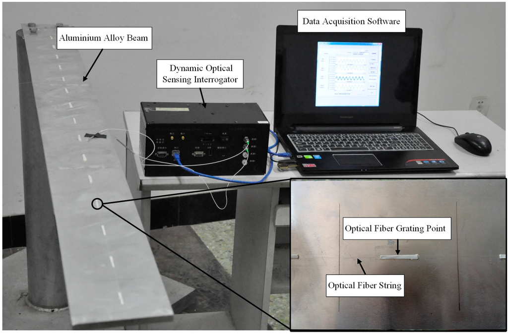 The test specimen used in this study is a standard cantilever beam which is commonly used in air vehicle and spacecraft. Figure 13 depicts the experimental setup used in this work. As shown, the beam is set up as a cantilever supported by four threaded bolts at the fixed end and is set free at the other end. Optical fiber sensors are employed in this study to obtain strain measurements. One potential benefit to choose optical fiber is that the optical fiber is light and thin which can reduce the effects of extra mass.