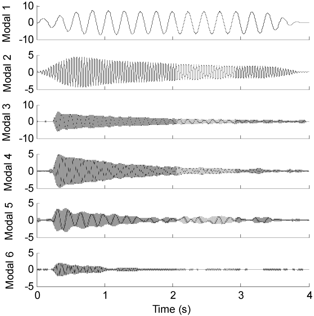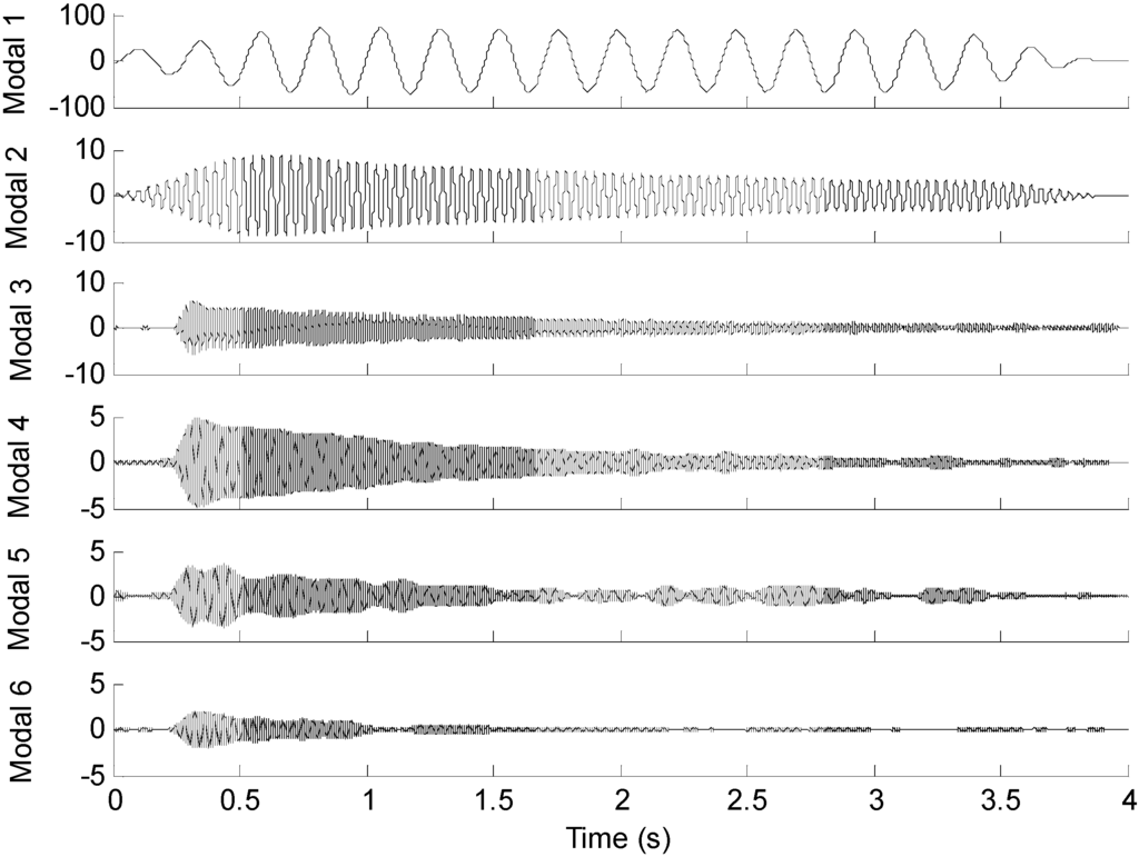 In real situation, predicting the response of the fixed end of the beam from measurements taken near the free end may be more problematic. In order to investigate the effect of the sensor location on the proposed method in practical experiment, the measured strain signal collected from the free end (the 15-th measurement point) is used to reconstruct the strain responses near the fixed end (the 1st measurement point). Figure 19 presents the first six modal responses obtained by the EMD method with intermittency criteria. Figure 20a shows measured strain responses near the fixed end and reconstructed strain responses in the first 4s. Figure 20b shows measured strain responses and reconstructed strain responses in 1.5~2 s for clear presentation.