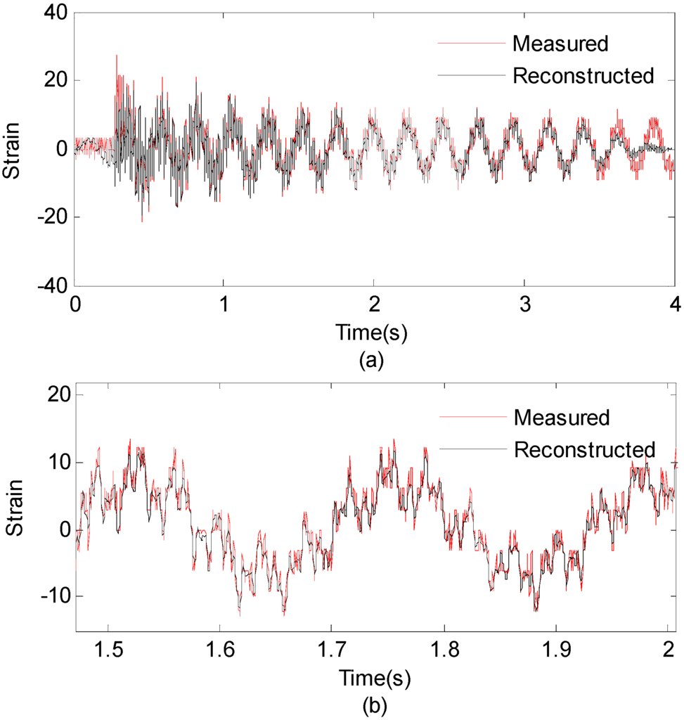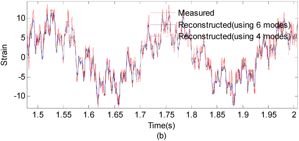(a) Measured strain responses and reconstructed responses using six modes and four modes; (0~4 s) (b) Results are concentrated on 1.5~2 s for clear presentation.