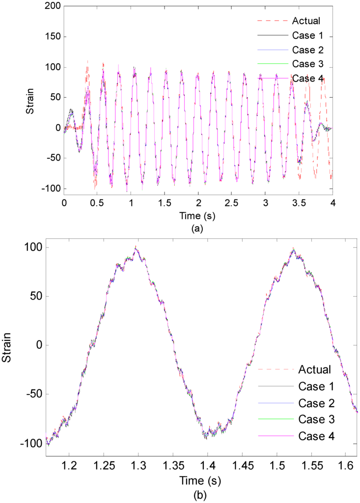 (a) Measured strain responses and reconstructed strain responses (using 1,2,3,14 measurement points) of the 5-th optical fiber measurement point on first 4 s; (b) Results are concentrated on 1.2–1.6 s for clear presentation.