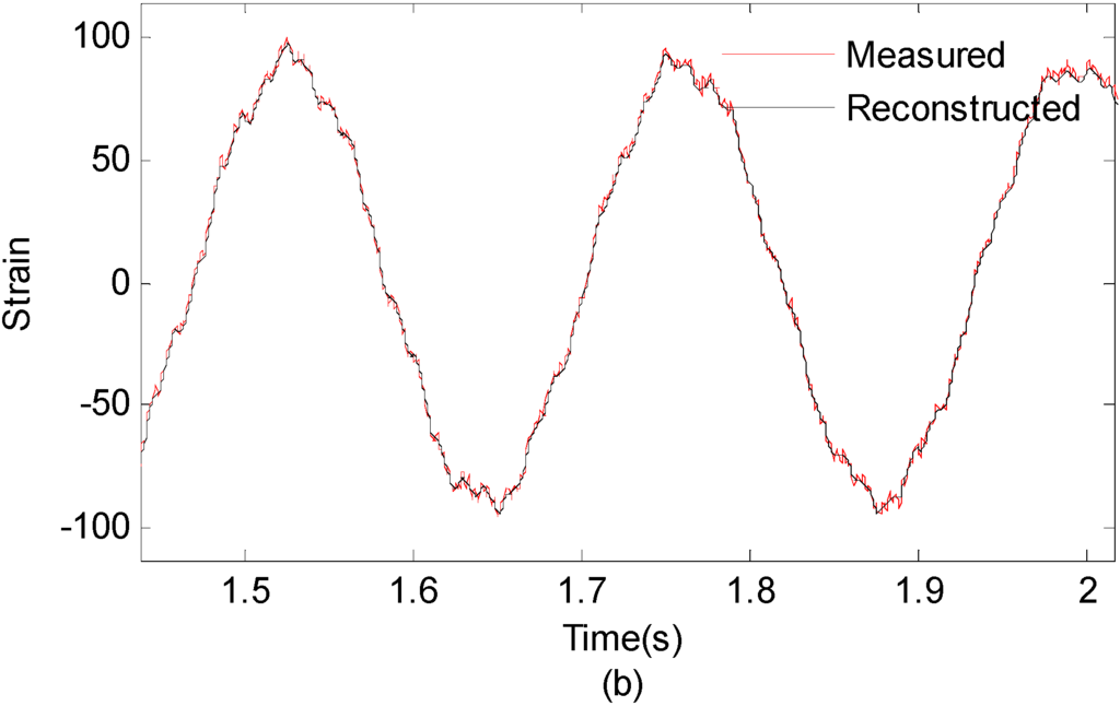 The correlation between the reconstructed strain responses using four modes and the measured strain results is 0.9052, which is 0.9222 for the six modes situation. It can be seen from the comparison between the reconstruction results using four modes and results obtained using six modes that it produces little effect when the number of used modes raises. This is possible because the frequency components in the Fourier spectra with low amplitude have no significant effect on the performance of the proposed method. Therefore, the accuracy of reconstruction results is effected little when the number of used higher modes increases. In some time or cost constrained cases, the higher modes can be safely discarded.