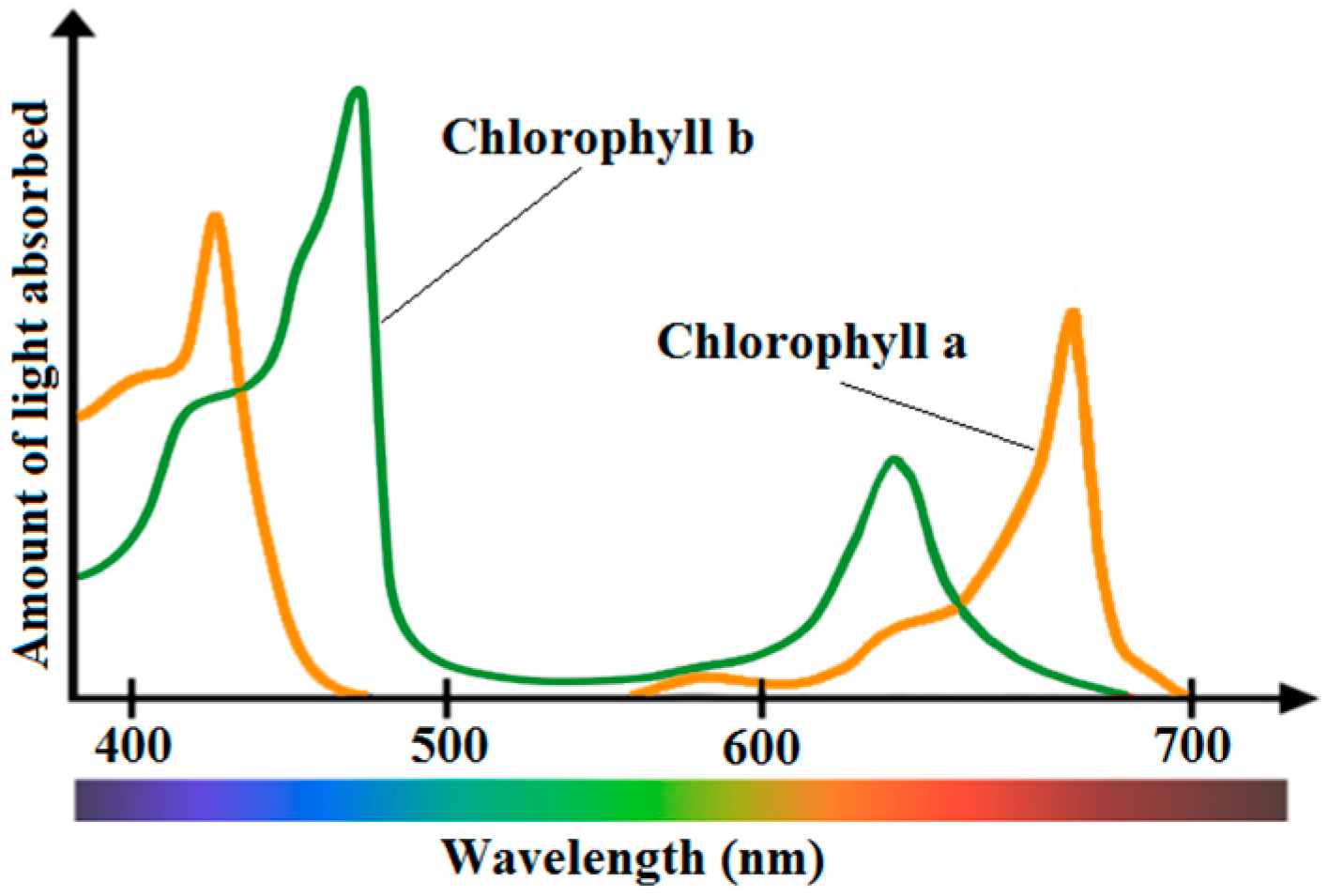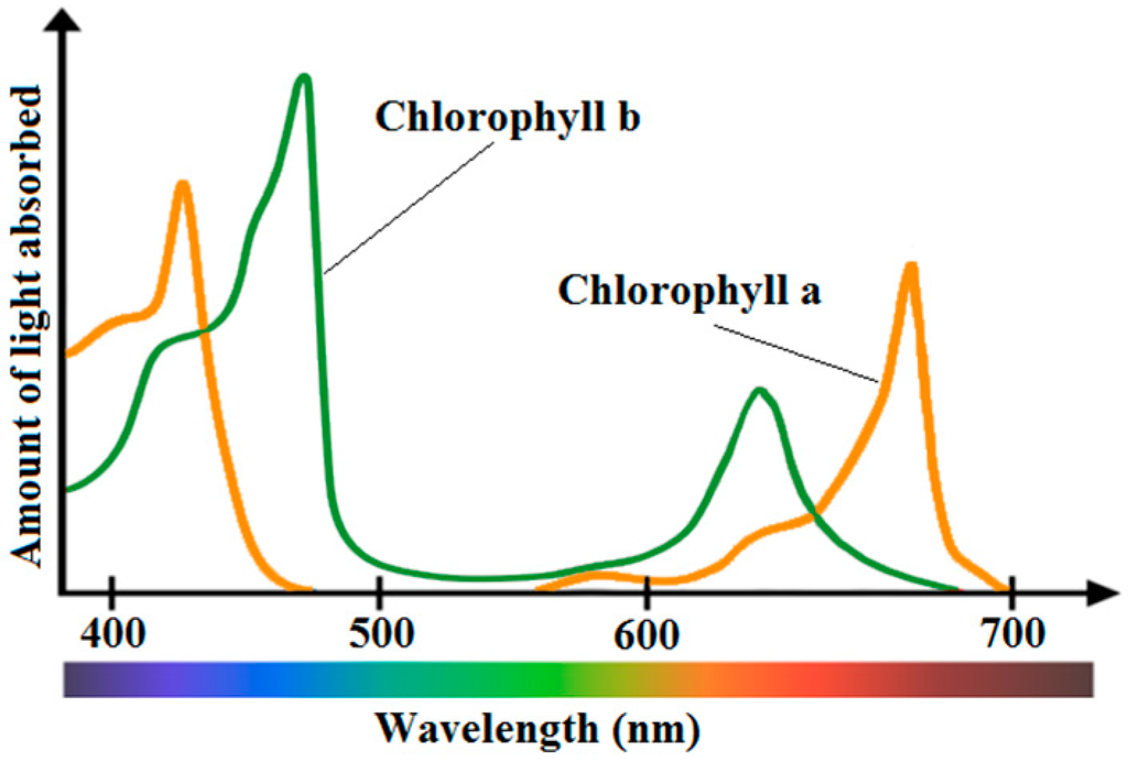 a while mainly reflecting green, absorbs most energy from wavelengths of violet-blue and orange-red light, whose reflectance causes chlorophyll to appear green. Obviously, the addition of chl-