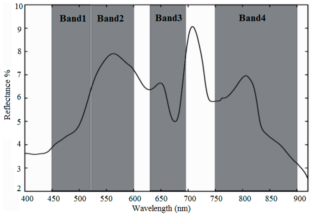 128] used Band 1 (445–530 nm), Band 2 (520–610 nm), Band 3 (640–720 nm), and Band 4 (770–880 nm) of IKONOS data to estimate chl-