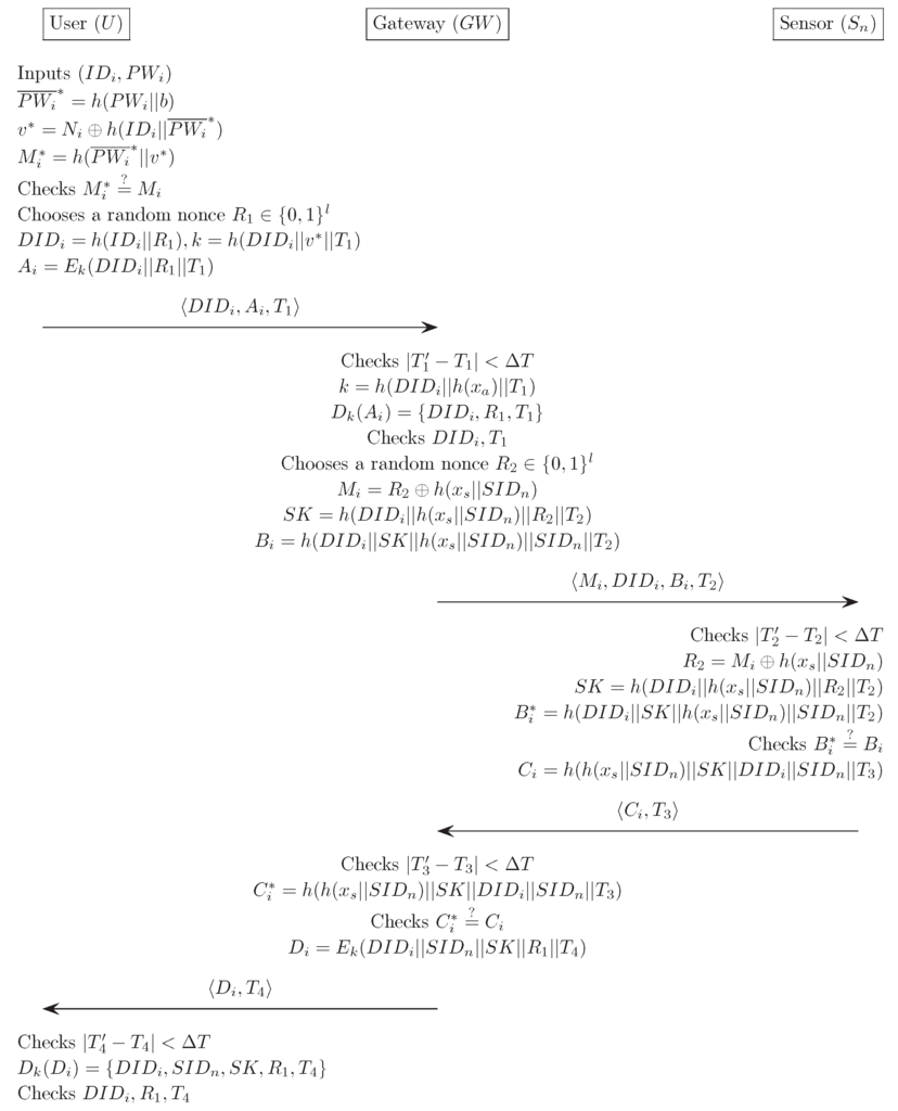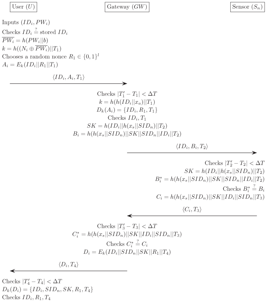 - Mutual authentication: Mutual authentication should be carried out between the user and gateway node, the gateway node and sensor node, and the sensor node and user, respectively.