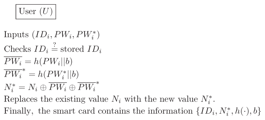 - The attacker inserts the ’s smart card into a terminal, and enters the , and , where and are the attacker’s arbitrary new passwords.