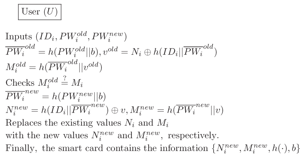 - Using obtained smart card, the attacker can successfully pass the checking process of the login phase through using the in the smart card, because their checking process just compares the entered with the stored in the smart card. The same situation also happens for the password change phase.