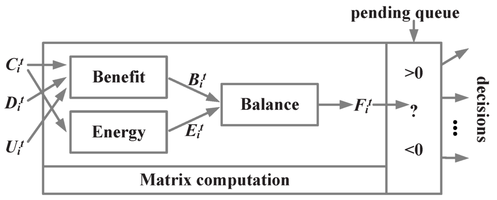To make communication decisions for each sensor data in pending queue, sensors balance the benefit of broadcasting with the energy cost as follows.
